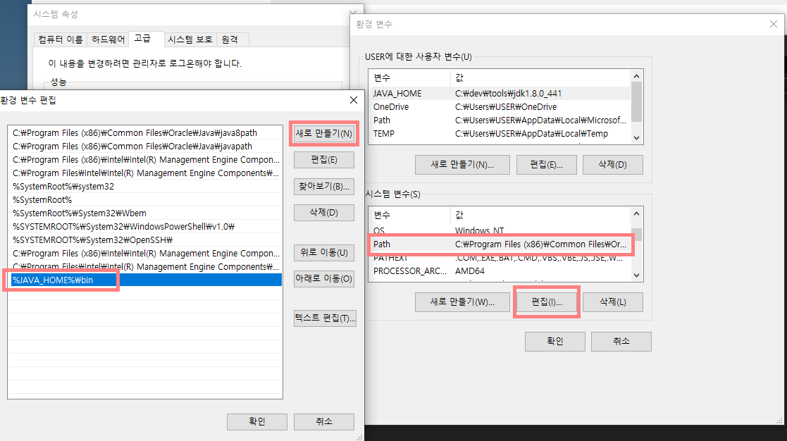 - ํ๊ฒฝ ๋ณ์ ํธ์ง์์ [์๋ก ๋ง๋ค๊ธฐ] ์ [%JAVA_HOME%\bin] ์ ๋ ฅ