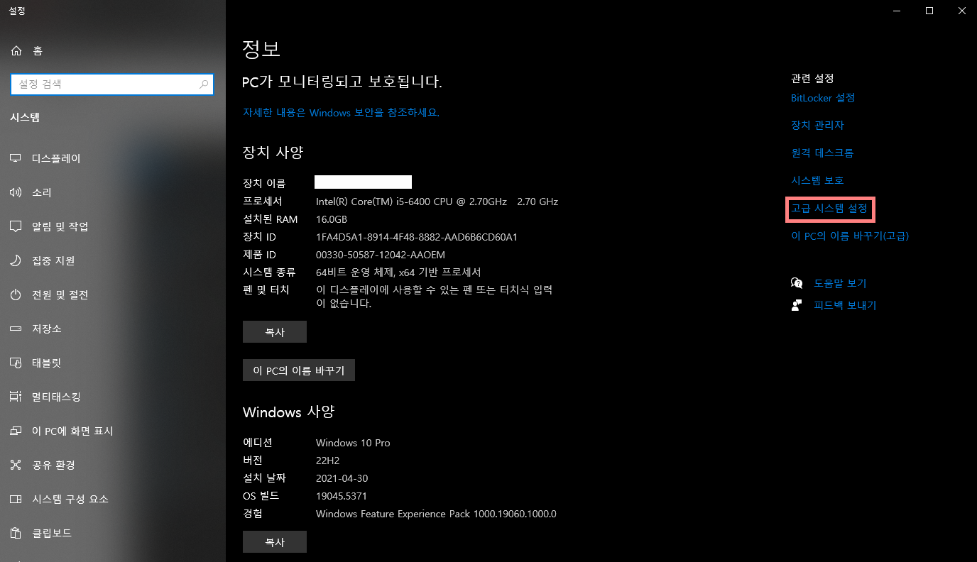 ๋ด PC > ์ค๋ฅธ์ชฝ ๋ง์ฐ์ค ํด๋ฆญ > ์์ฑ > ๊ณ ๊ธ ์์คํ ์ค์